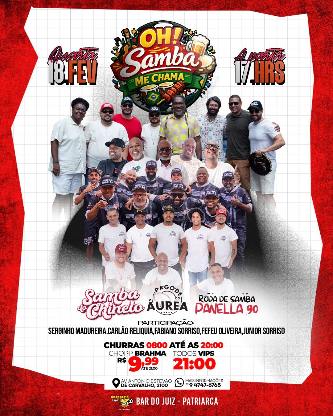 Na próxima quarta-feira, 18/02, a partir das 17h, o Bar do Juiz – Patriarca recebe mais uma roda de samba daquelas que já estão virando tradição. 🎶 Atrações confirmadas: • @sambadochinelo • @pagode_do_aurea_oficial • @panella_90